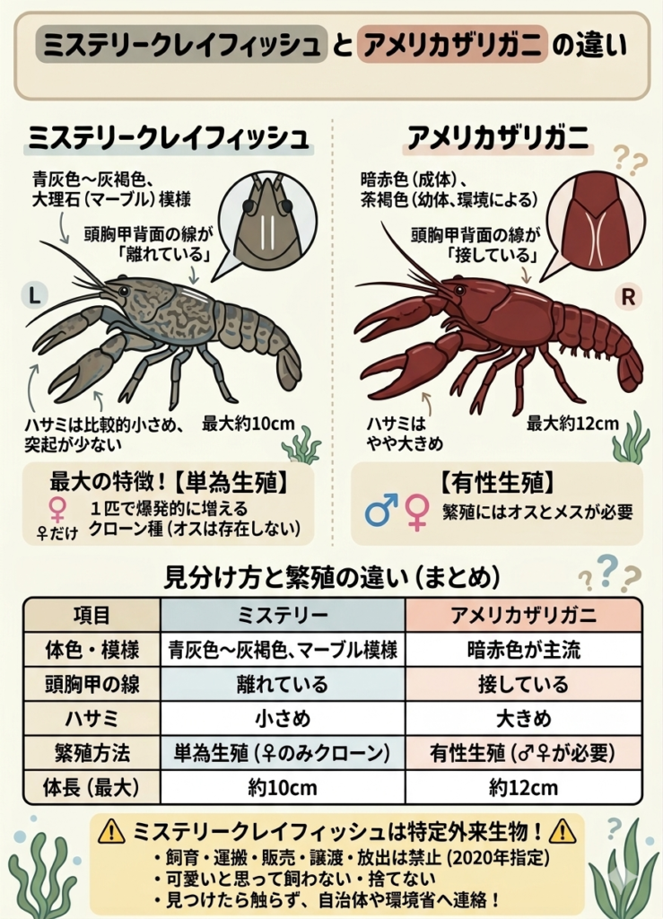 ミステリークレイフィッシュとアメリカザリガニの違いについて解説します。